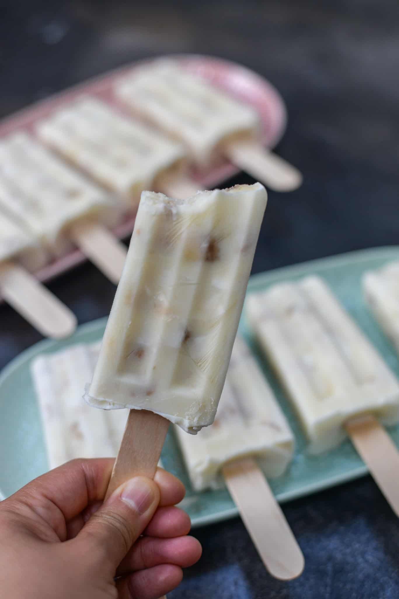 Close the moulds, insert the sticks and place them in the freezer for 5-6 hours until fully set. If you’re freezing them overnight, let them sit at room temperature for a couple minutes before serving so they soften slightly.