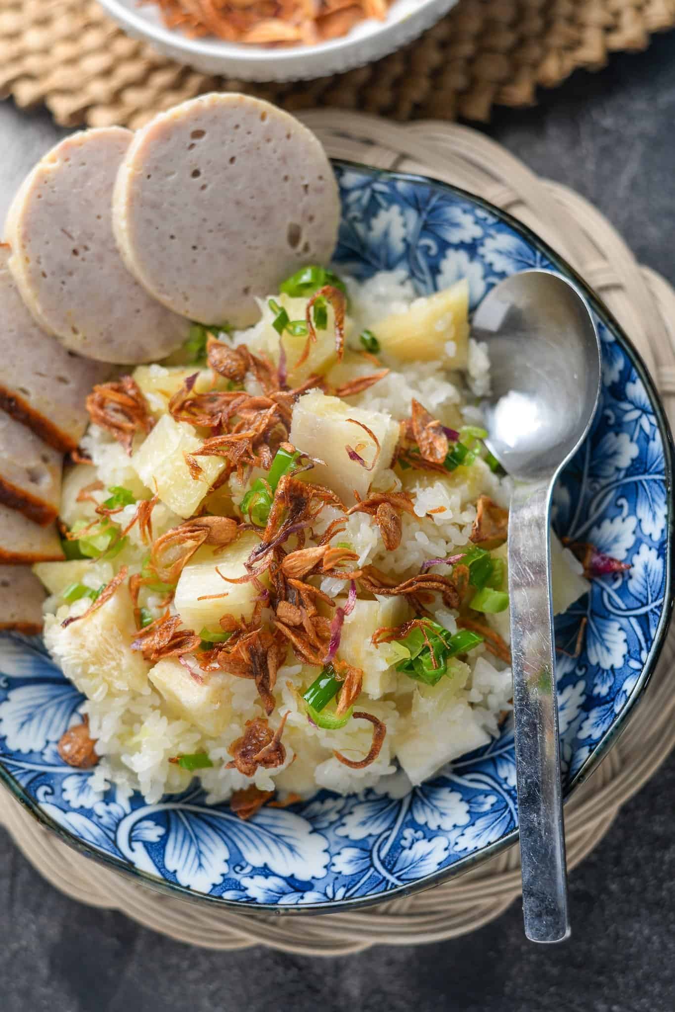 Once the first 35 minutes of steaming are done, remove the muslin bag from the steamer and transfer the rice and cassava to a large plate. Drizzle the reserved onion oil over and gently mix without breaking the cassava pieces. Let it rest for five minutes then return it to the steamer for another 15-20 minutes, with a few pandan leaves for fragrance (optional).