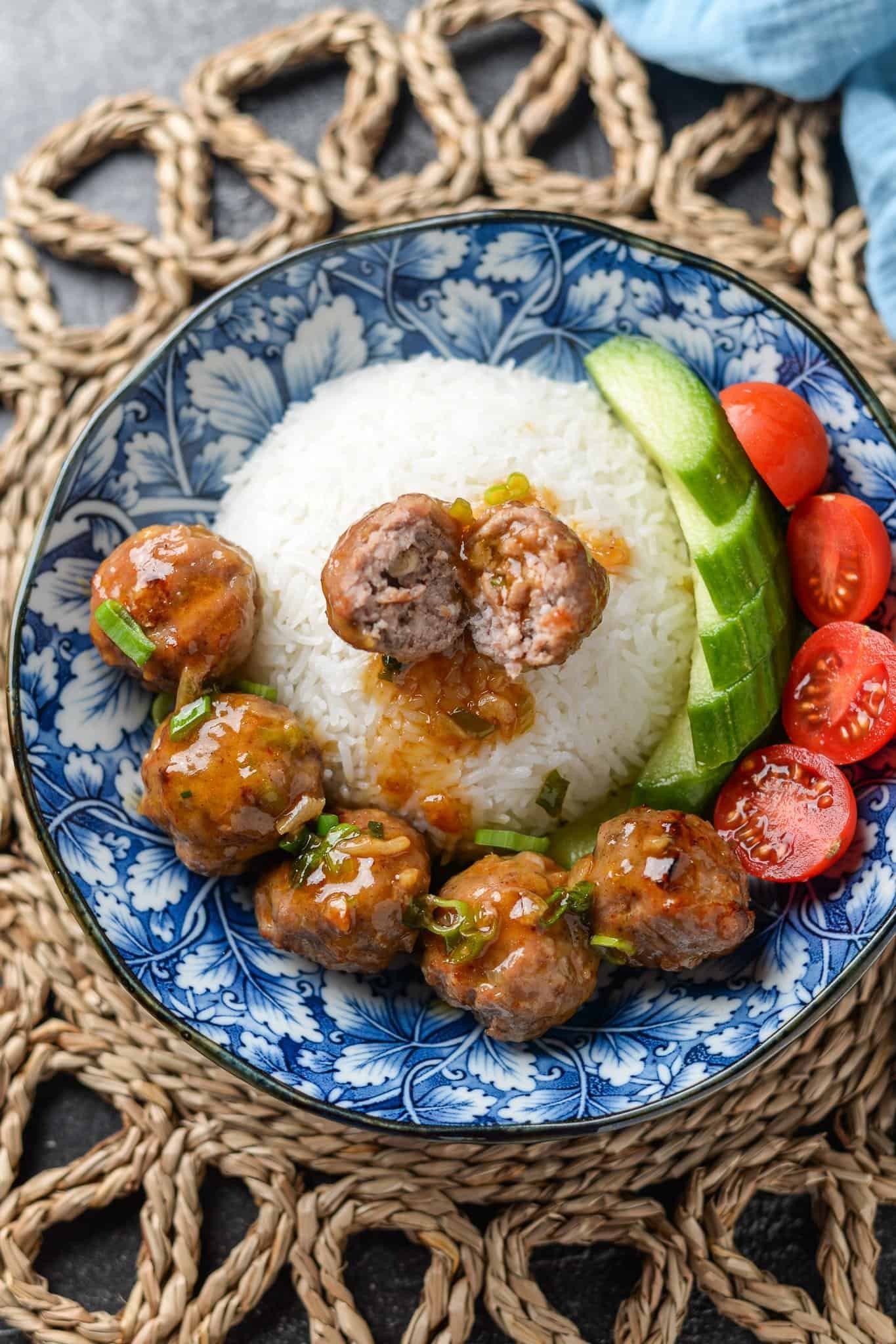 This dish was an instant success. Soft, juicy pork meatballs coated in a glossy garlic and fish sauce glaze, served simply with steamed rice, sliced cucumber and sweet baby tomatoes for freshness and crunch. Everything comes together in one beautiful bowl of contrasting flavours and textures.
