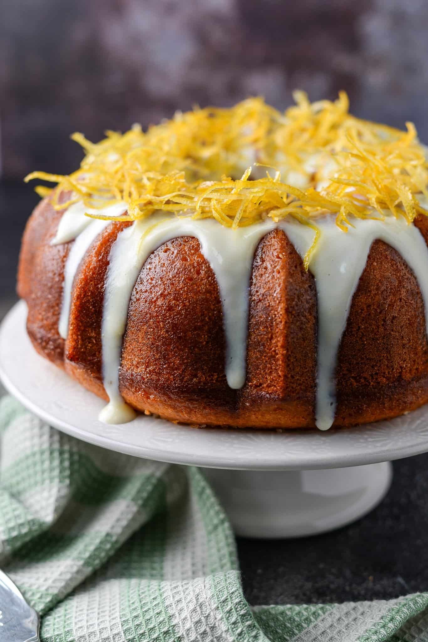 - Drizzle over the cooled cake and top with candied lemon rind.Â