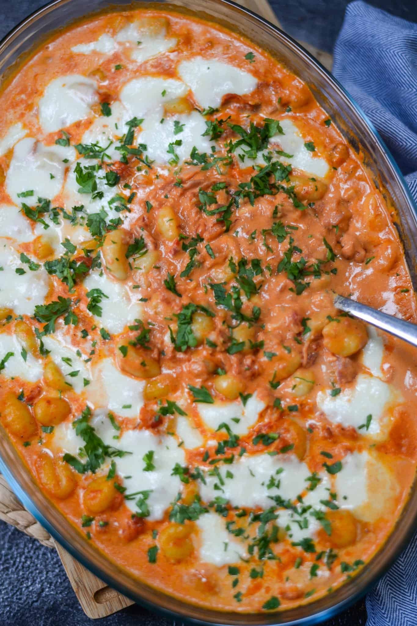 Transfer the gnocchi mixture into a casserole dish. Sprinkle generously with mozarella cheese and bake in the oven for 15 minutes until golden and bubbly.