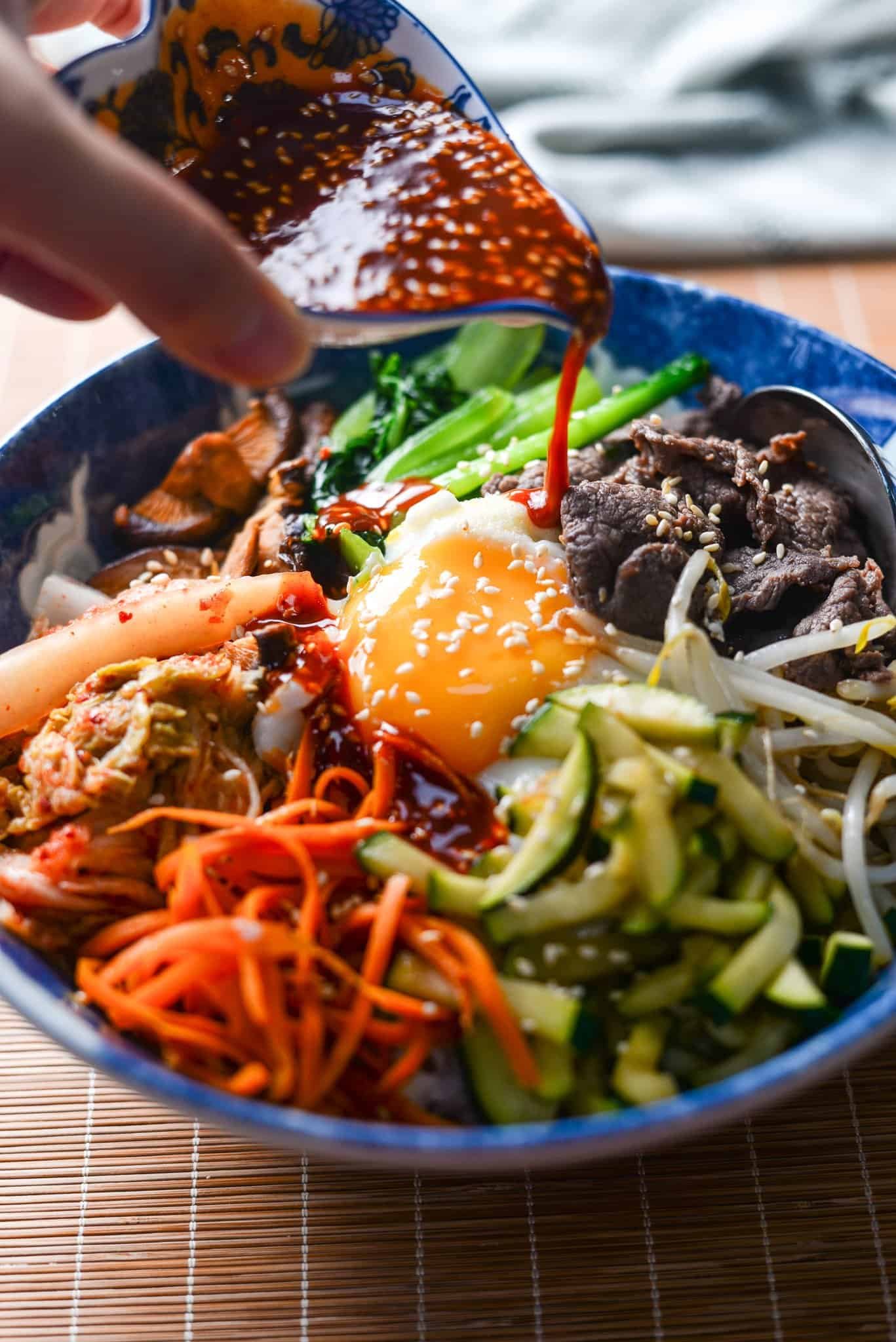- Arrange beef, vegetables and kimchi on top, add the fried egg in the middle, sprinkle sesame seeds and drizzle with Gochujang sauce.