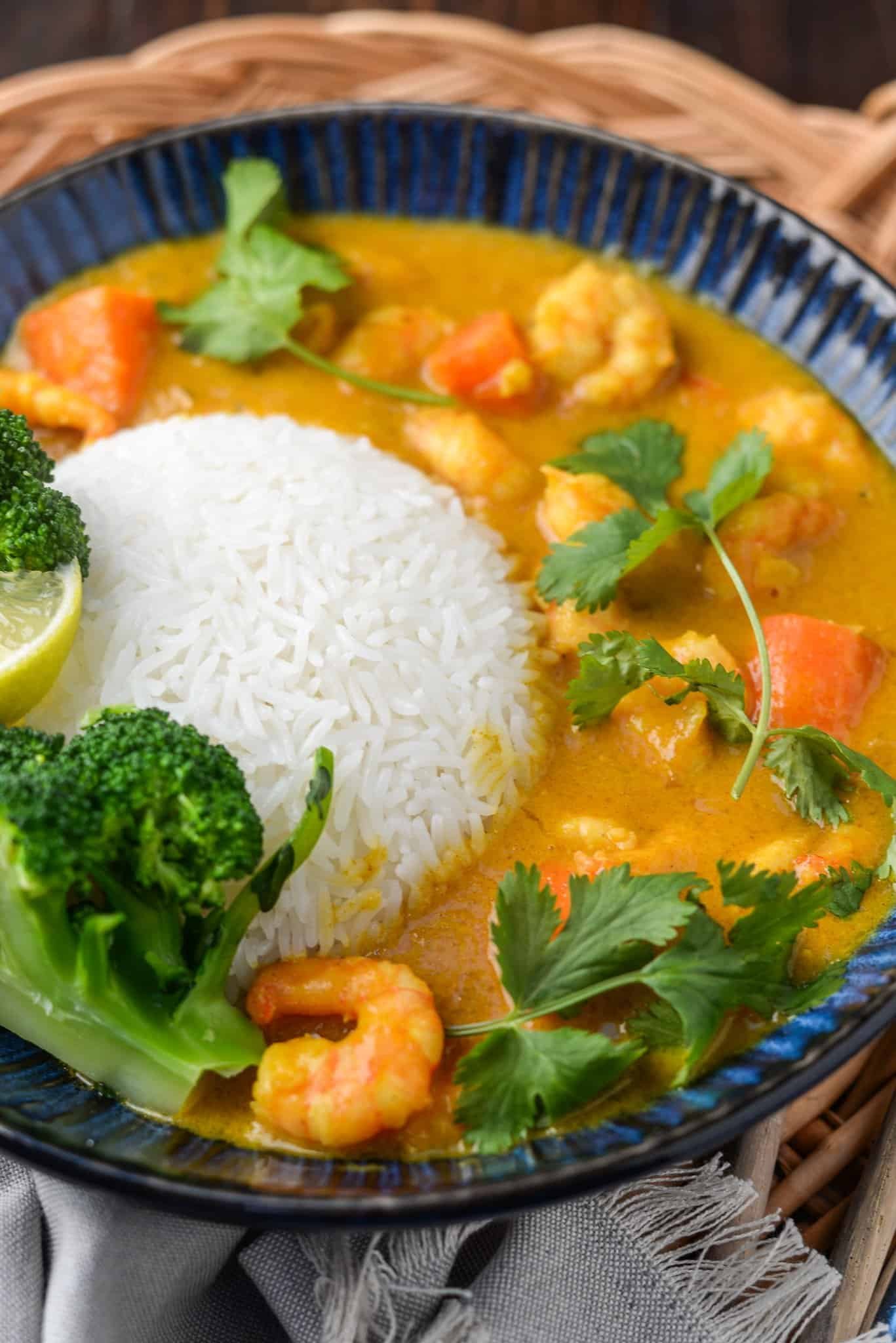 This Simple Mango and Prawn Curry is best served with fluffy steamed rice to soak up the delicious sauce.